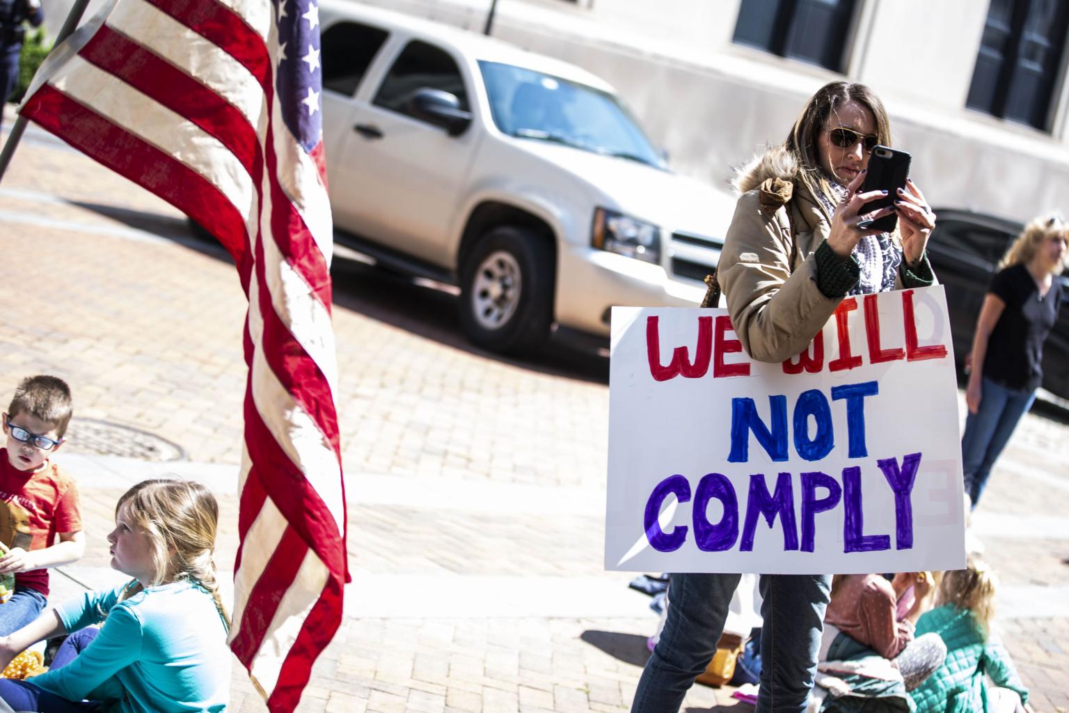 Demonstrators stand outside of the Virginia State Capitol in Richmond, Virginia, on April 16, 2020.