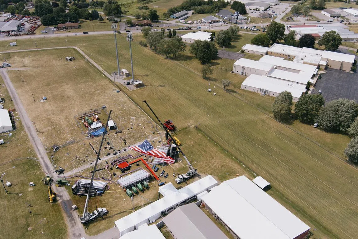 An aerial view of the Butler Farm Show ground, where former president Donald Trump spoke at the rally. Figures can be seen on the roof at right where a gunman fired at Trump.