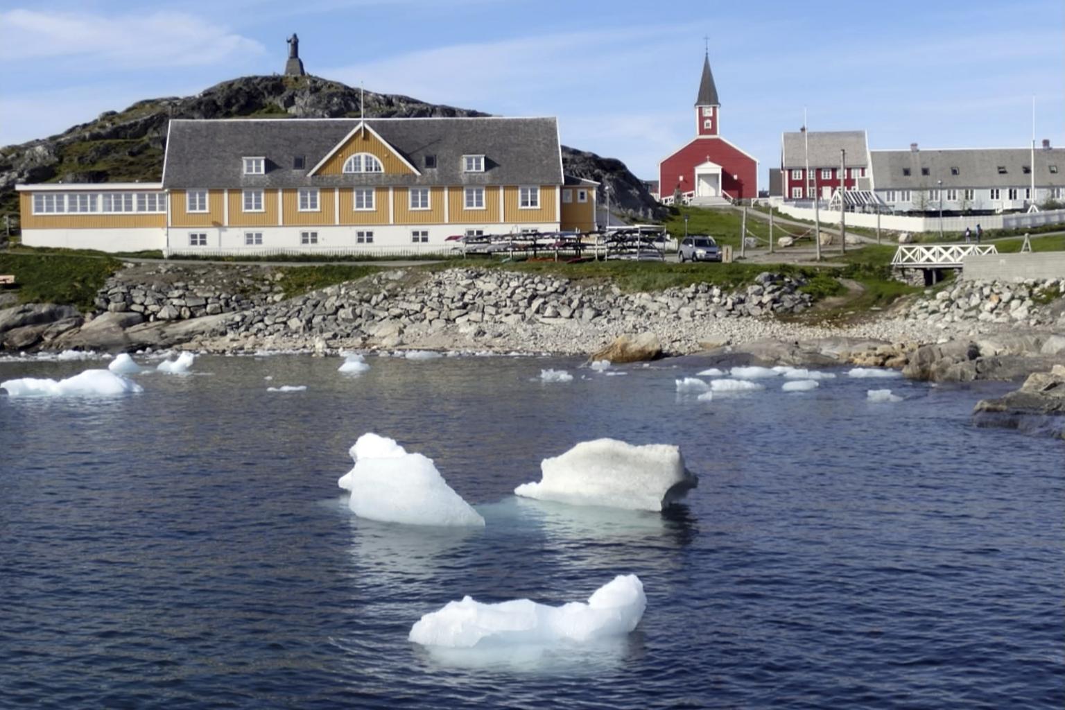 Small pieces of ice float in the water off the shore in Nuuk, Greenland, on June 13, 2019.