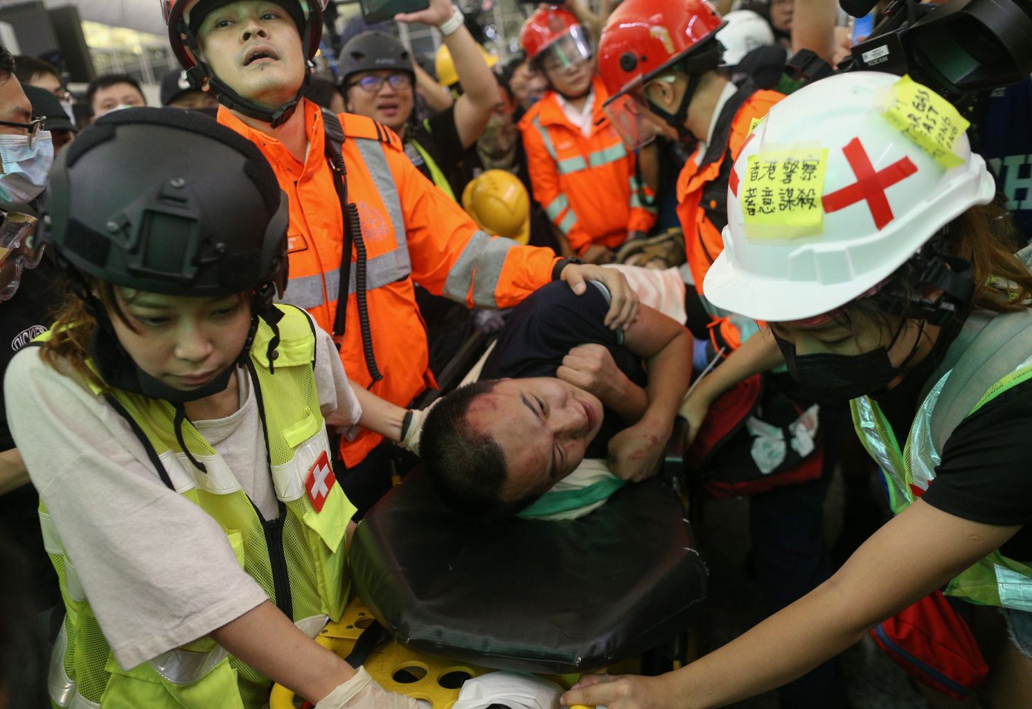 An injured man whom protesters accused of being an undercover police officer is being taken by medical personal after clashes with anti-government protesters at Hong Kong's international airport.