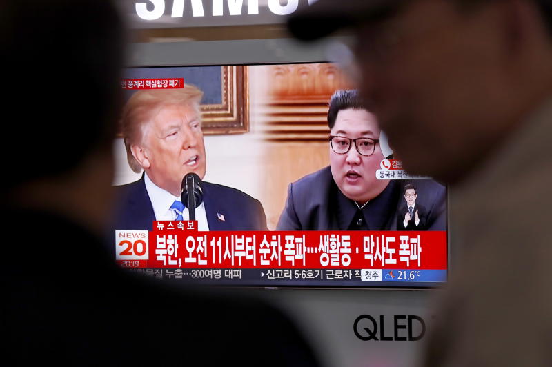 South Koreans watch a television news broadcast, showing US President Donald Trump and North Korean leader Kim Jong Un, in Seoul on May 24, 2018.
