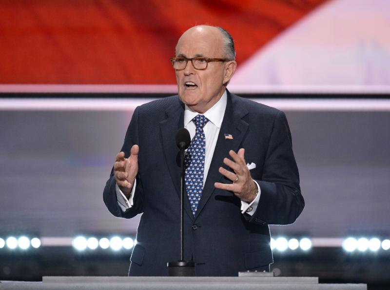 Former New York City Mayor Rudy Giuliani does a sound test on the opening day of the Republican National Convention at the Quicken Loans arena in Cleveland, Ohio, on July 18, 2016.