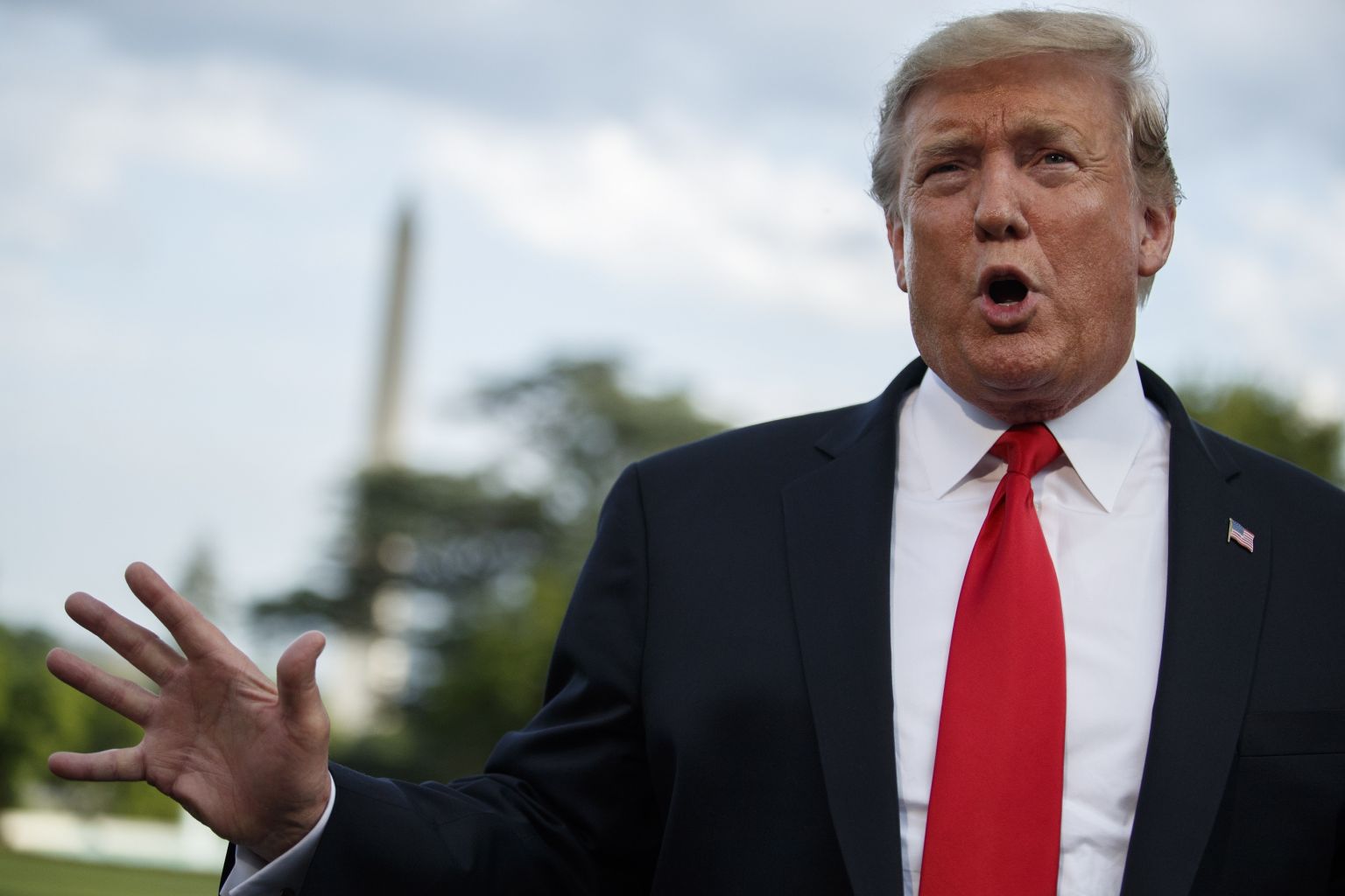 US President Donald Trump responds to a question from the news media as he walks to board Marine One on the South Lawn of the White House in Washington on May 20, 2019.