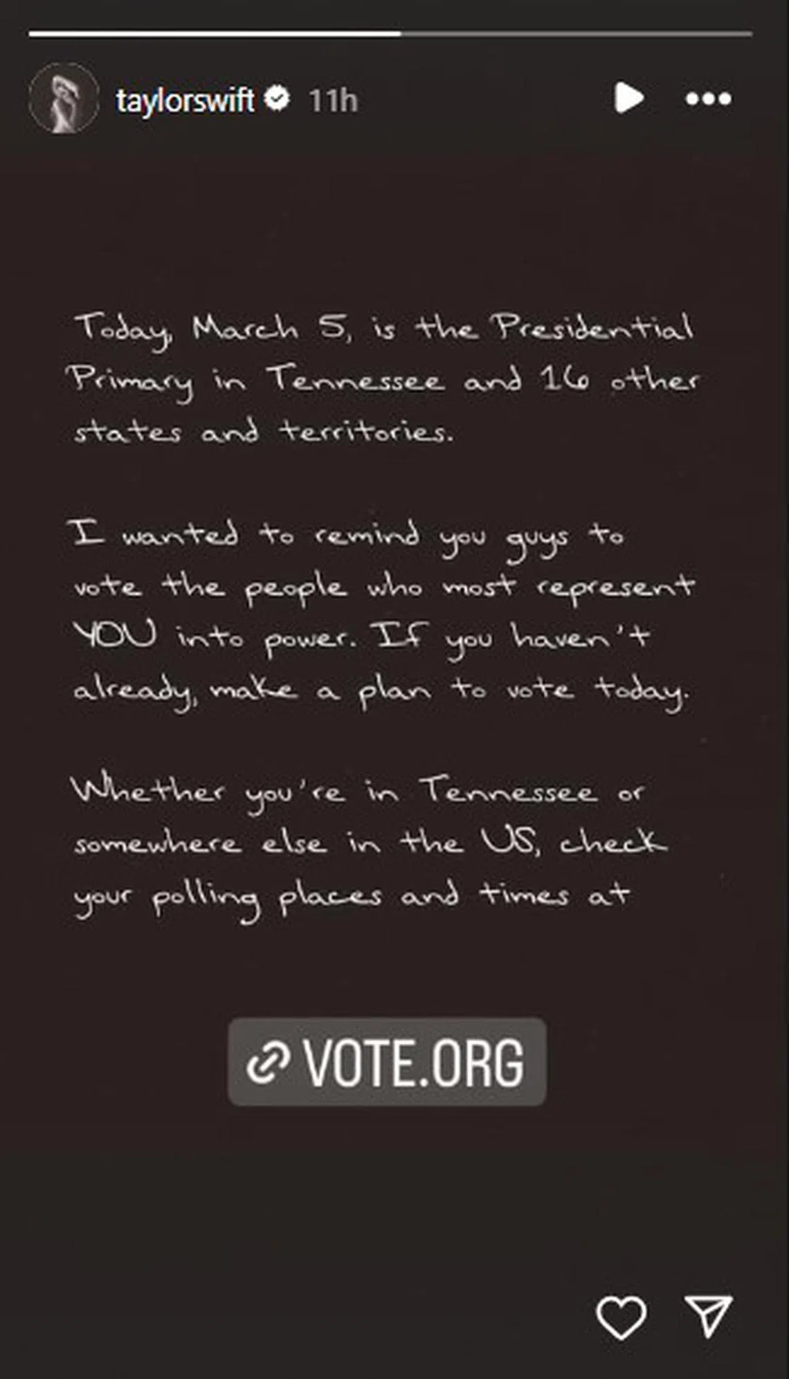 Pop megastar Taylor Swift encouraged her fans to vote in a post on Instagram,