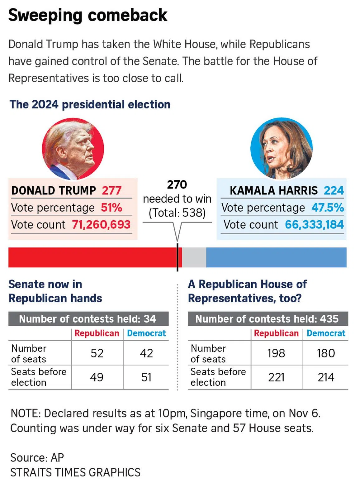 While the key states of Michigan, Arizona and Nevada remained too close to call at press time, he had already surpassed Ms Harris in the tally of electoral votes, 277-224, in the process of securing the simple majority needed to win the White House.