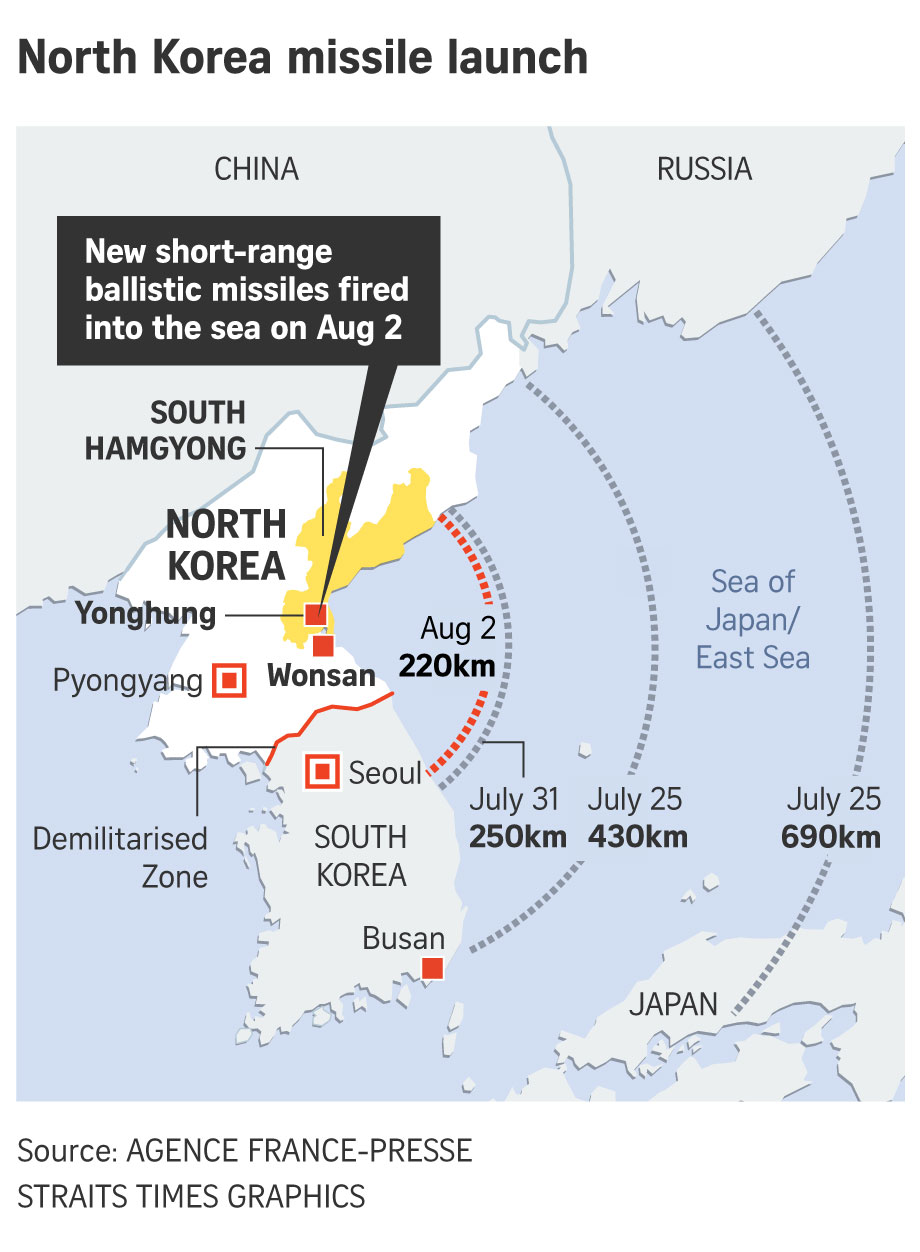 North Korea fired two short-range ballistic missiles early on Wednesday, only days after it launched two similar missiles on July 25.
