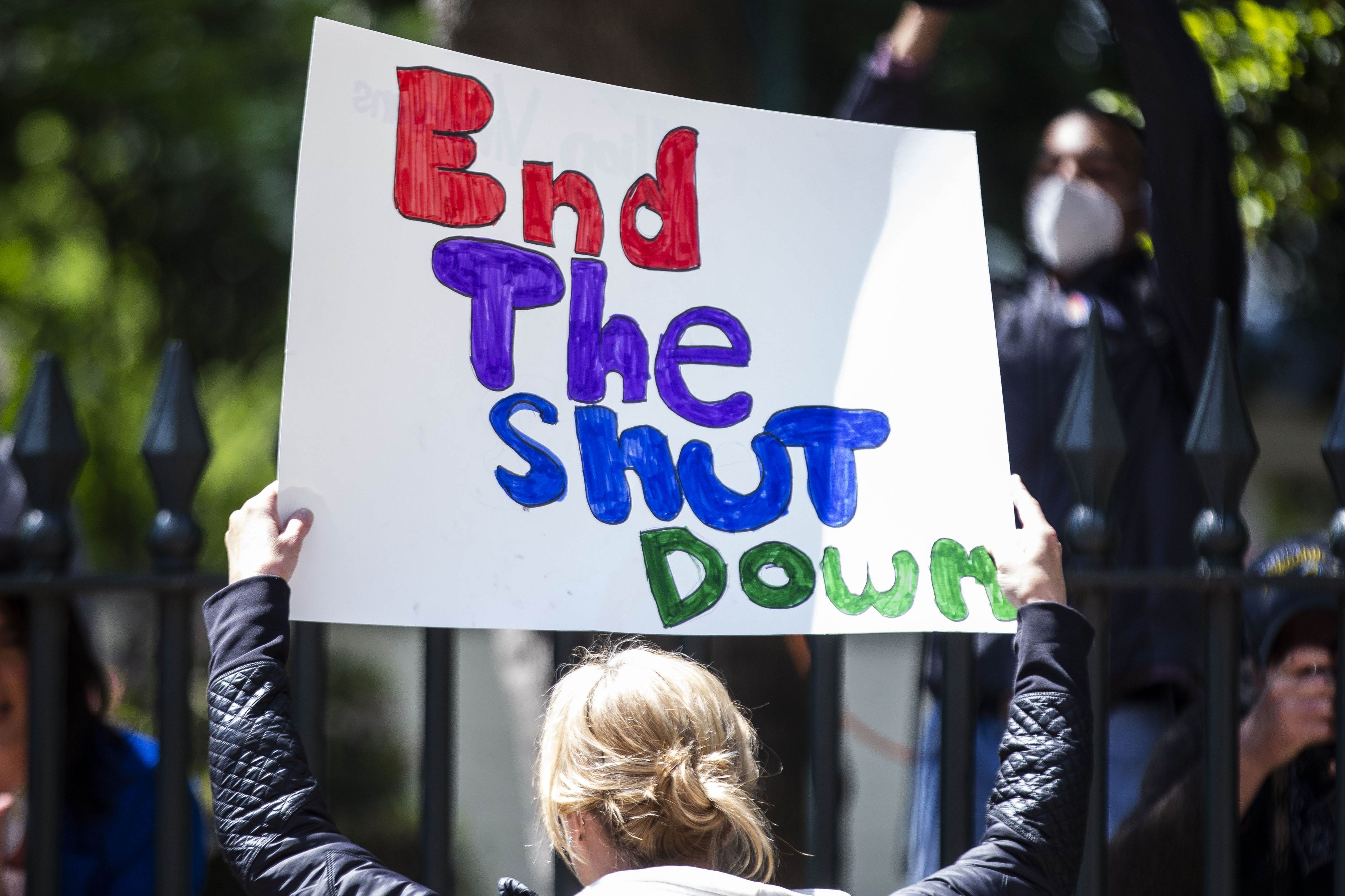 A demonstrator is seen holding a sign decrying the coronavirus lockdown in Virginia on April 16, 2020.
