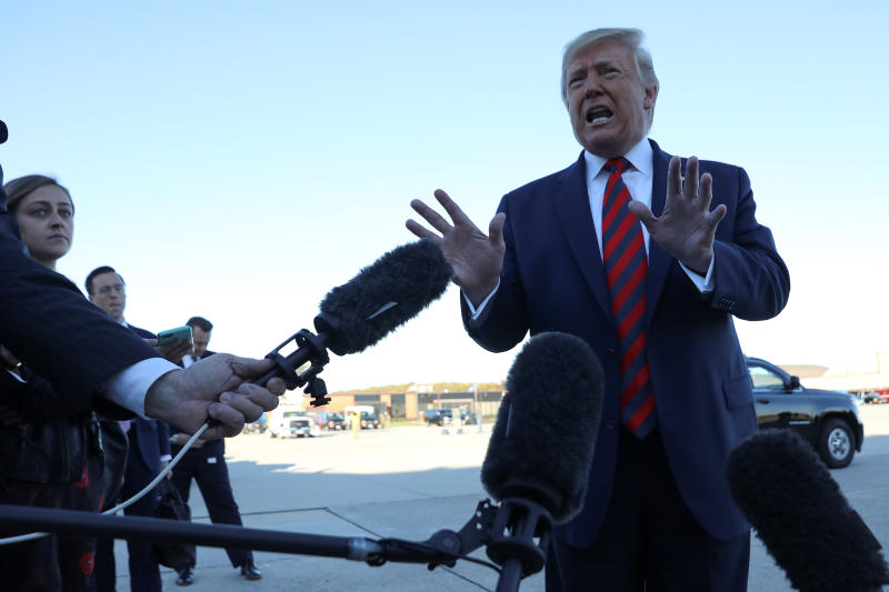 US President Donald Trump speaking to reporters at Joint Base Andrews in Maryland on Oct 28, 2019.
