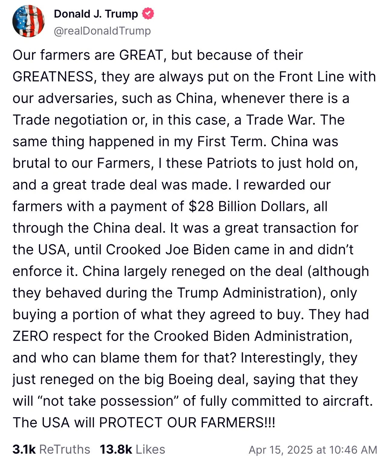 Mr Trump took aim at Beijing again on April 15, saying on Truth Social that China did not fully fulfil an earlier trade deal. He appeared to be referencing a pact that marked a truce in both sides’ escalating tariffs war during his first term.