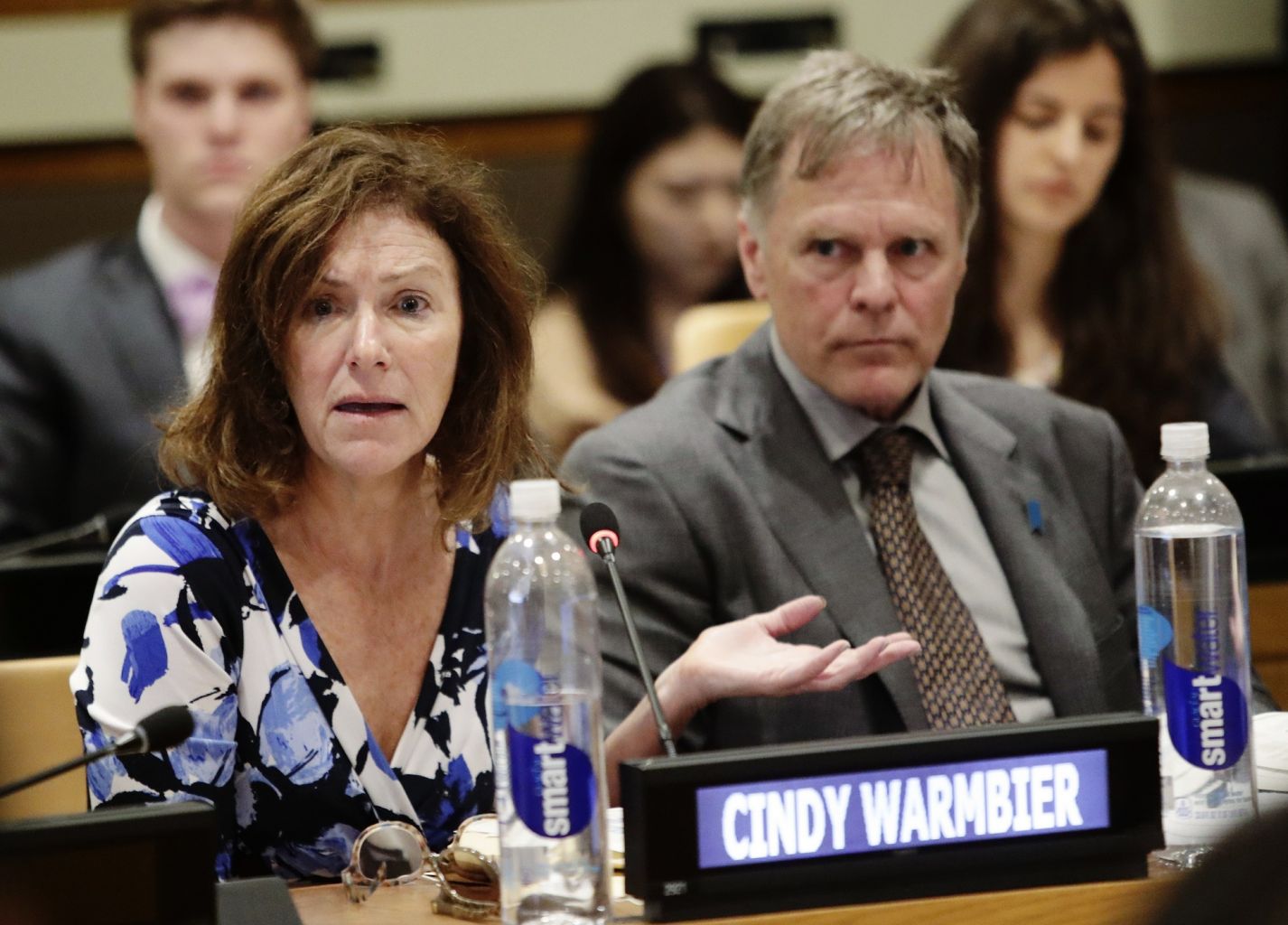 In a 2018 photo, Fred Warmbier listens as his wife Cindy speaks of their son Otto at the United Nations headquarters.