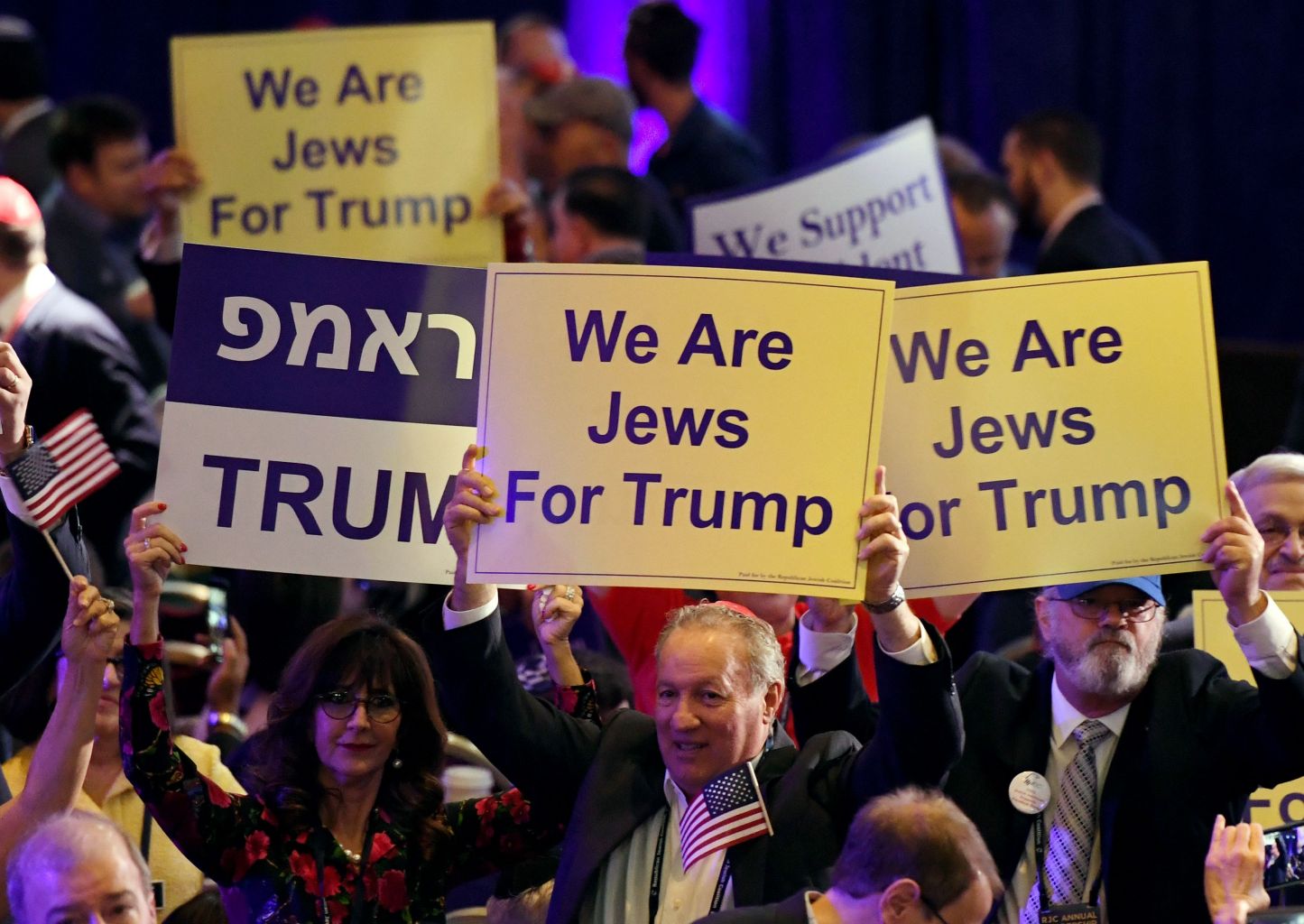 Earlier three protesters stood on their chairs as Trump began to speak, shouting "Jews are here to say - occupation is a plague."