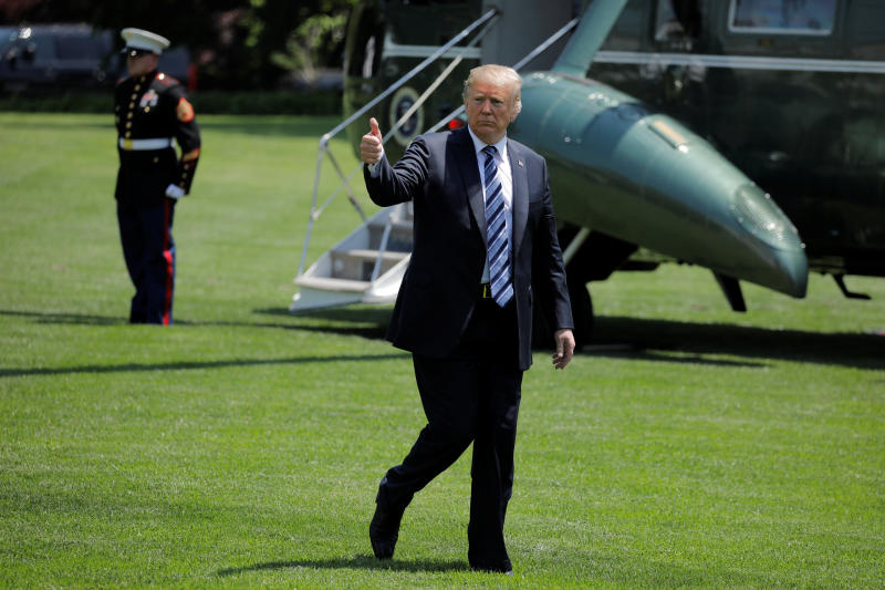 US President Donald Trump gives a thumbs up as he returns from a trip to Annapolis, Maryland, on May 25, 2018.