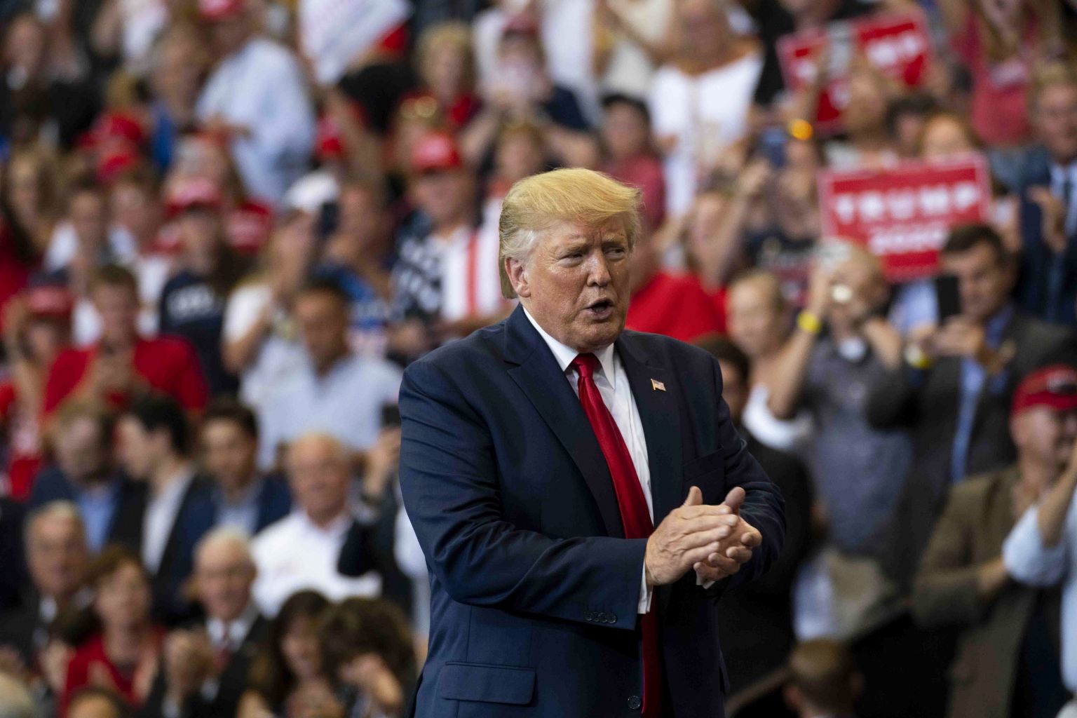 Trump onstage during a rally in Cincinnati, Aug 1, 2019.