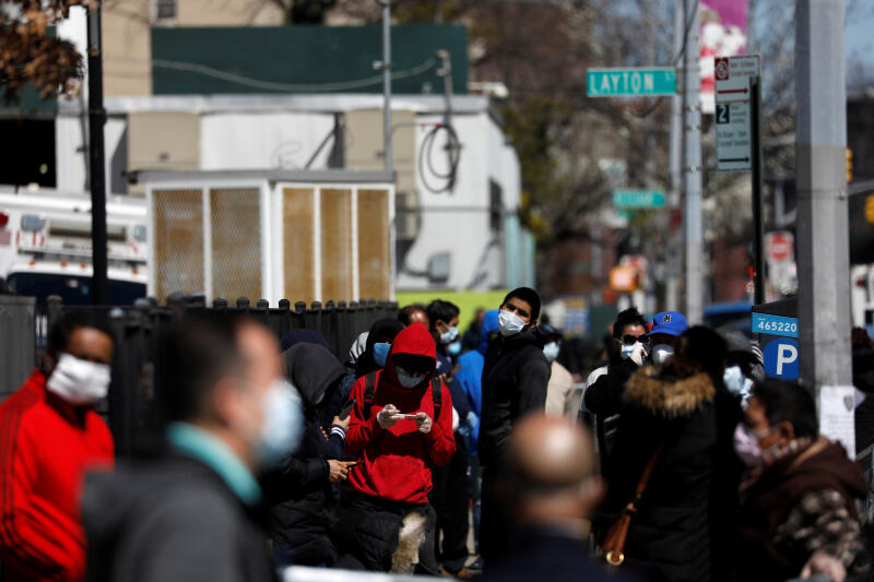 People queue to enter a tent set up to test people for the coronavirus at the Elmhurst Hospital Center in Queens, New York, on March 27, 2020.