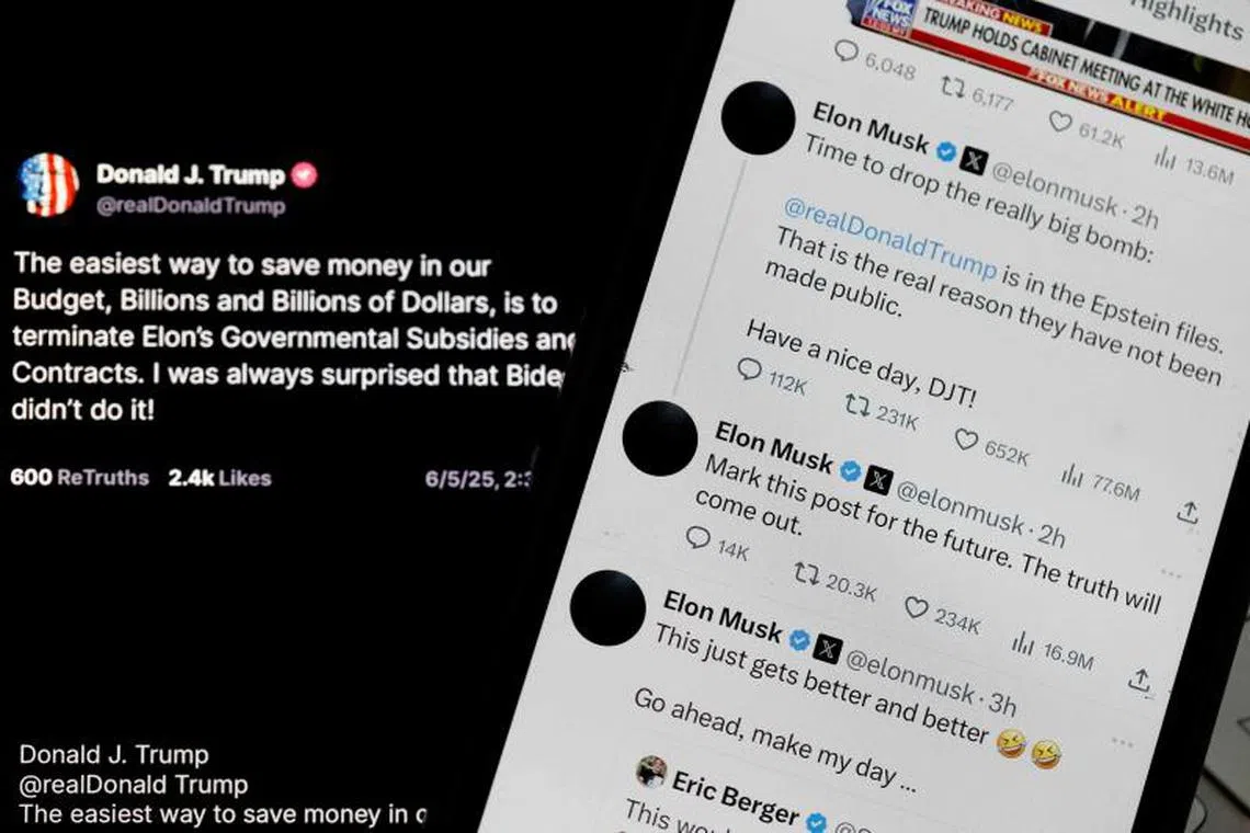 Social media posts by US President Donald Trump and Mr Elon Musk displayed side by side on June 5.