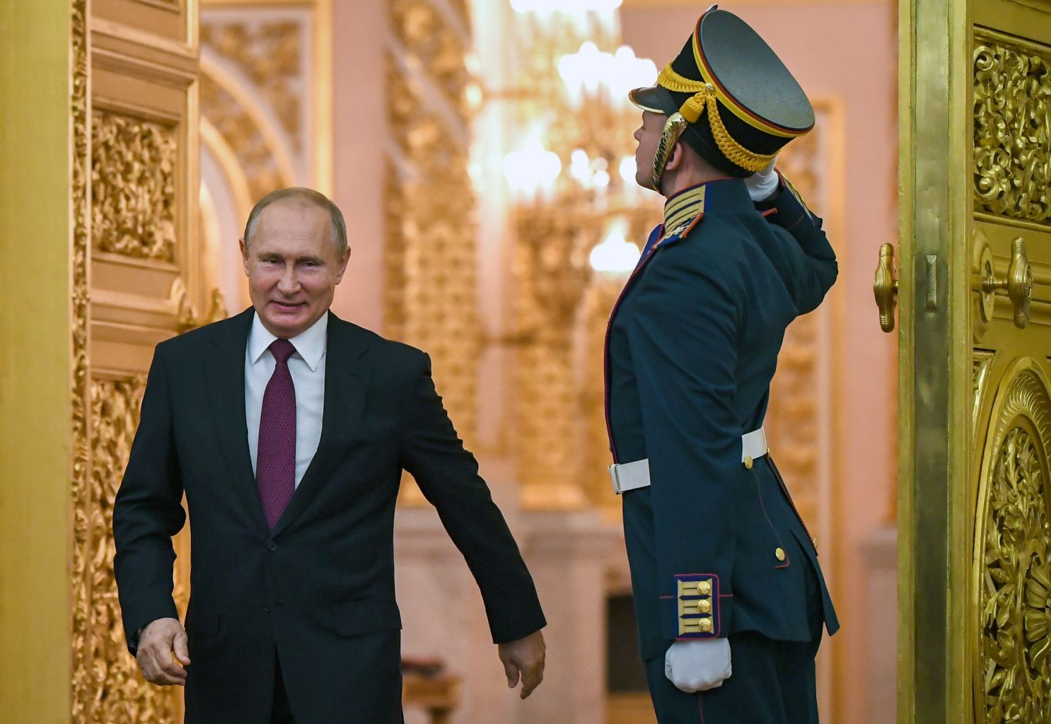 Putin (left) arrives at an awards presentation at the Grand Kremlin Palace in Moscow, June 12, 2019.