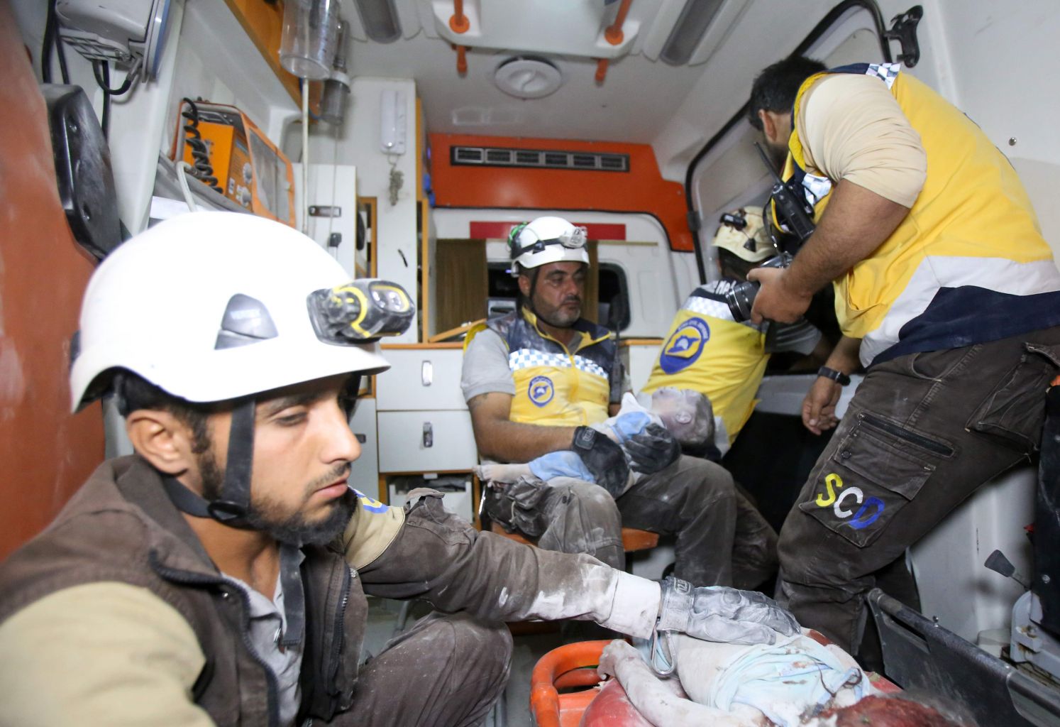 "White Helmets" transport young victims in an ambulance following a reported airstrike by Syrian regime forces on the town of Maaret al-Numan in Syria's northwestern Idlib province on Aug 28, 2019.
