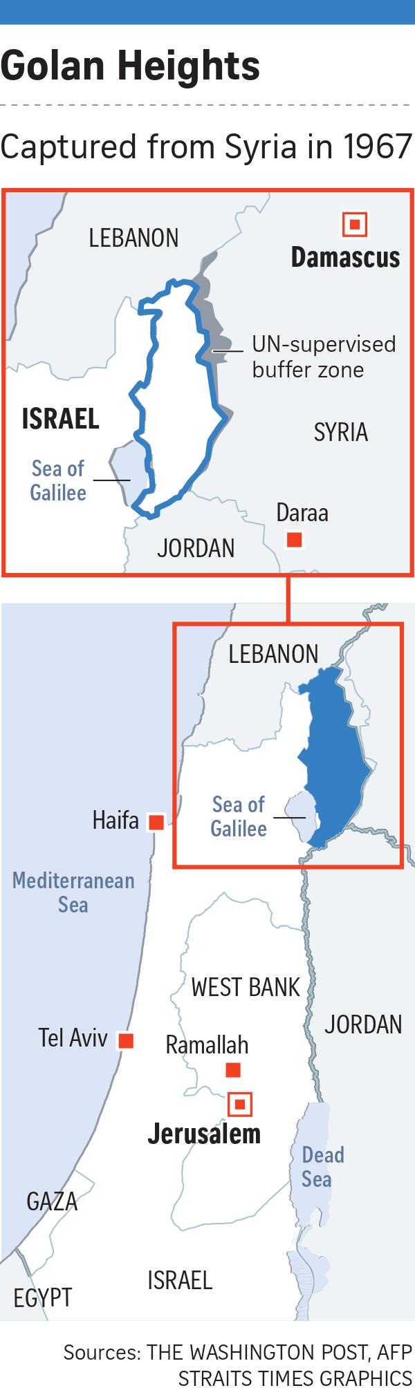 WASHINGTON (REUTERS) - U.S. President Donald Trump on Monday recognised Israel's 1981 annexation of the Golan Heights, a border area seized from Syria in 1967, in a dramatic shift from decades of US policy and an election boost to visiting Israeli Prime Minister Benjamin Netanyahu.