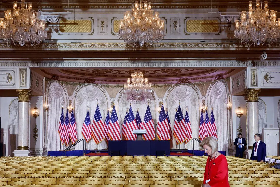 Hours before the speech, supporters began filling a ballroom decorated with several chandeliers and lined with dozens of American flags.