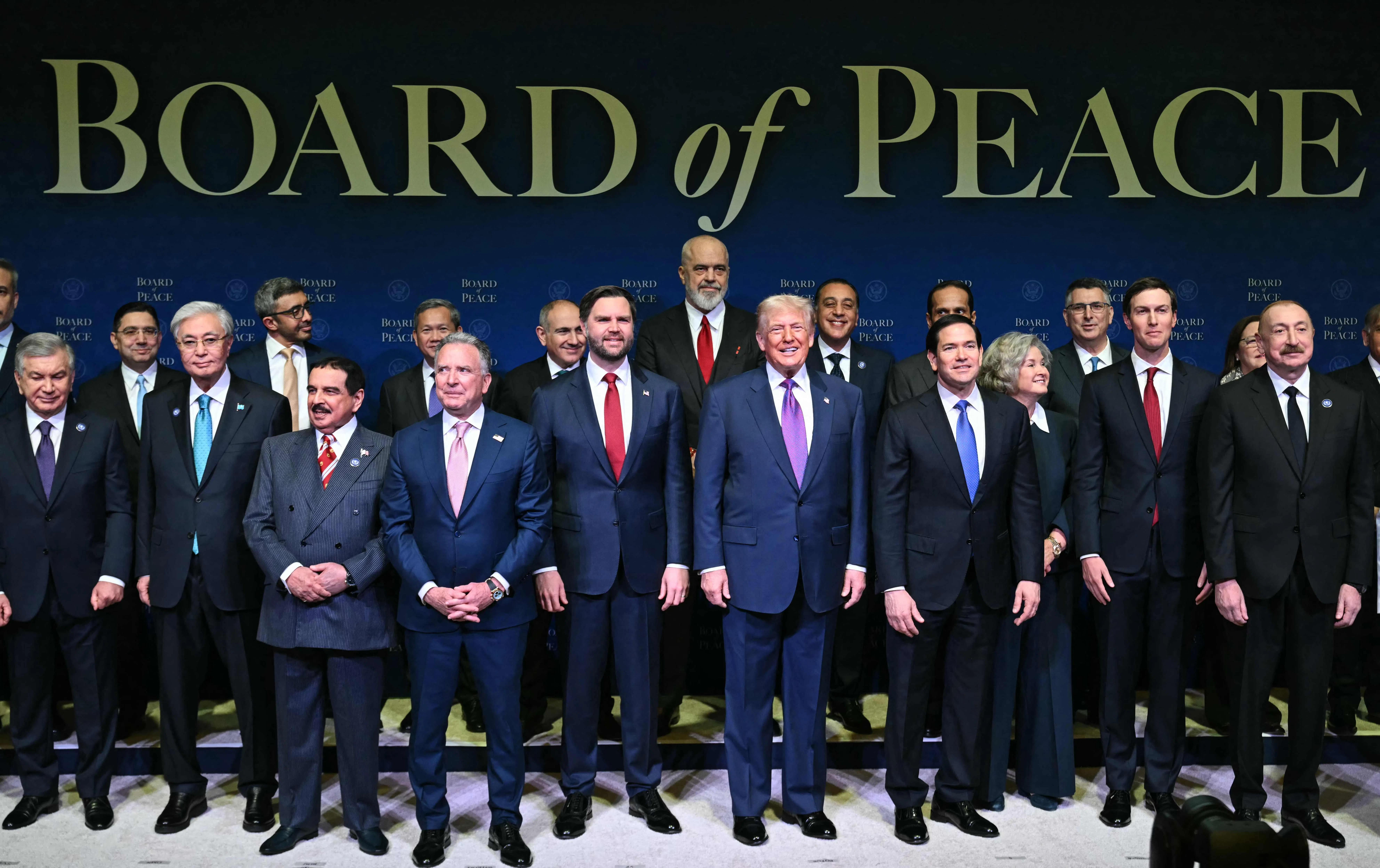 US President Donald Trump (centre) posing for a photo with world leaders and other attendees of the inaugural Board of Peace meeting on Feb 19, flanked by US Vice-President J.D. Vance (left) and US Secretary of State Marco Rubio.