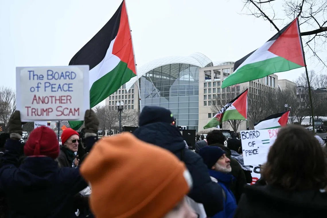 Pro-Palestinian demonstrators protesting on Feb 19 outside the US Institute of Peace, where the inaugural Board of Peace meeting was being held.