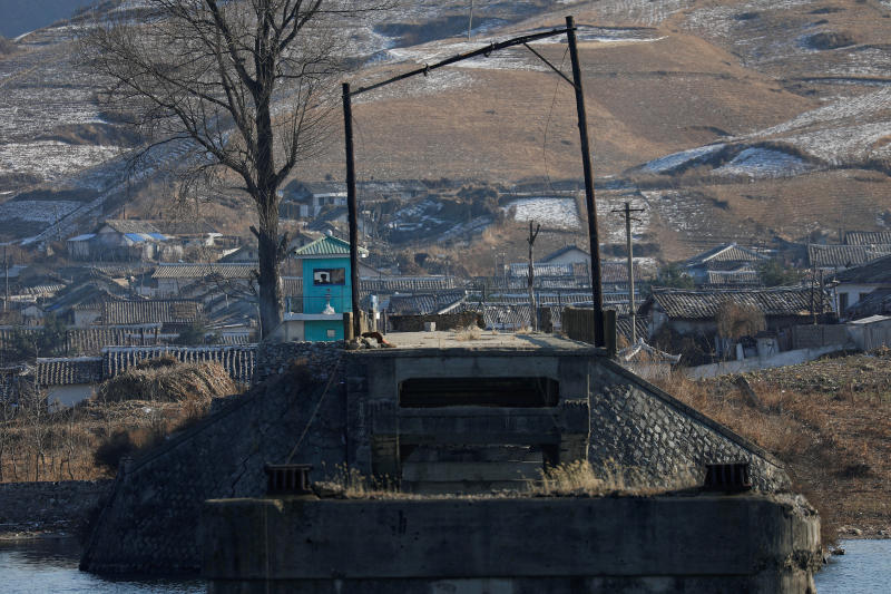 A North Korean border guard, as seen from the Chinese side of the border north of Dandong, China, takes position at Hekou's Broken Bridge over the Yalu River, north of the towns of Sinuiju in North Korea on Nov 20, 2017.