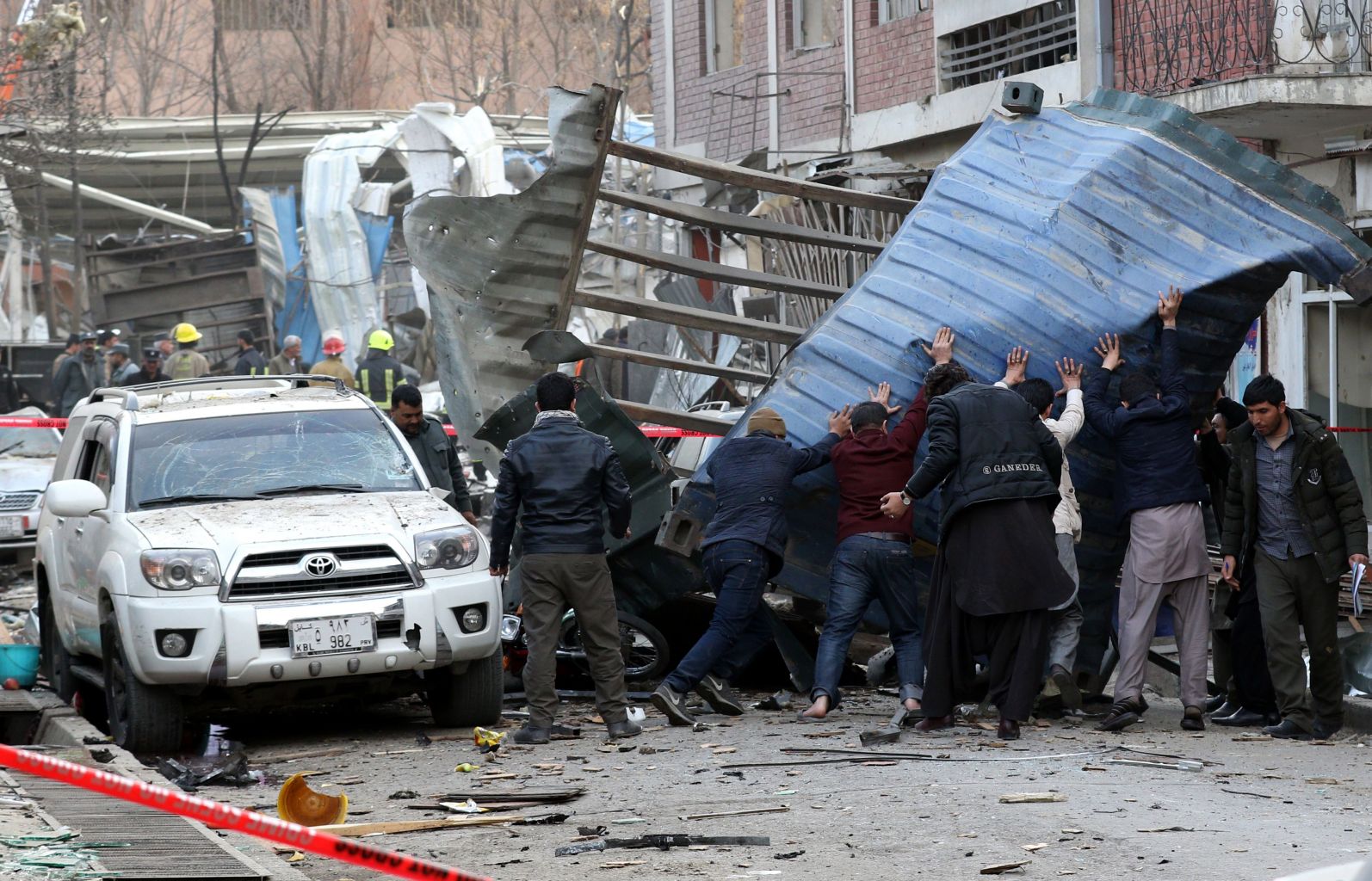 People try to remove debris from the scene of a suicide bomb attack in Kabul on Jan 27.