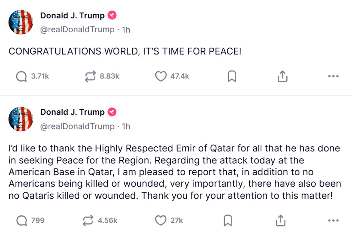 WASHINGTON – US President Donald Trump on June 23 dismissed Iran’s retaliatory strikes against an American base in Qatar as “weak” and sought to draw a line under the US bombing of Iran’s nuclear infrastructure by calling for regional peace.
