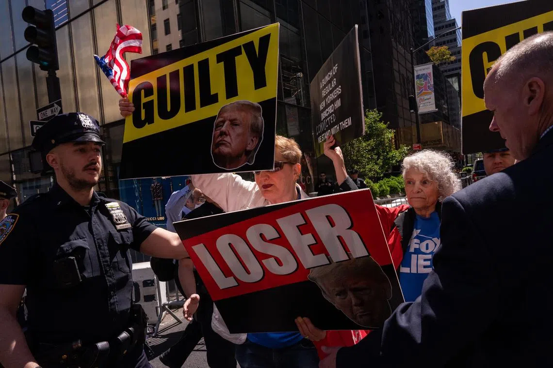 Anti-Trump protesters outside Trump Tower before former President Donald Trump speaks in New York, on May 31.