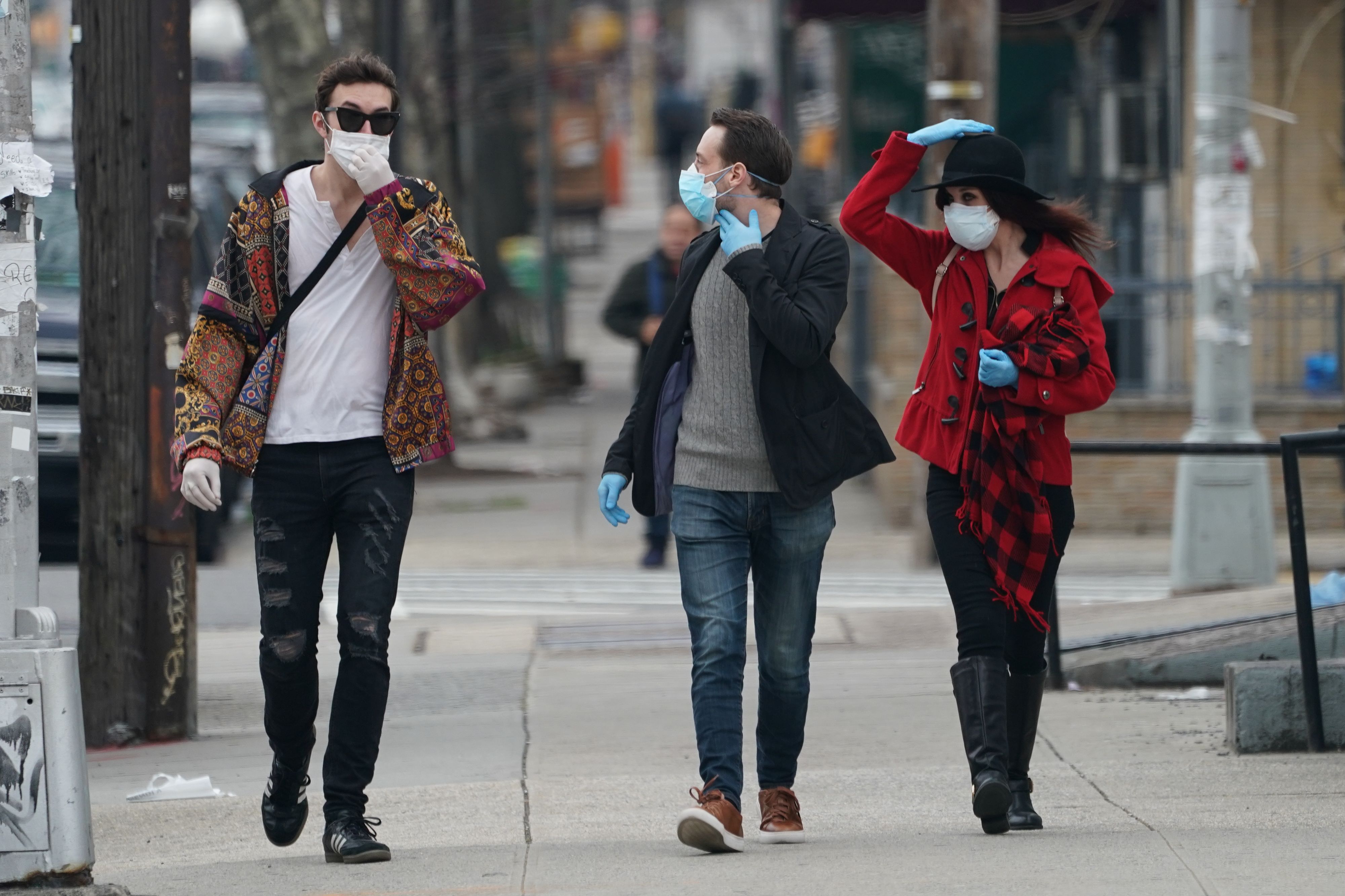People wear masks while walking through Brooklyn, New York, on April 5, 2020.