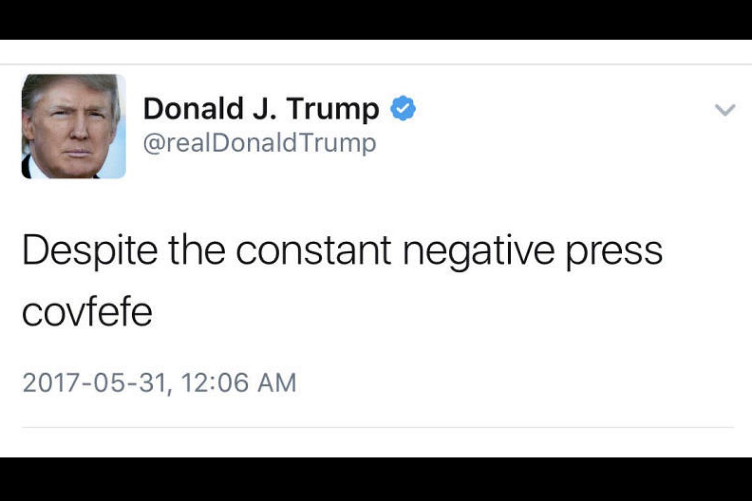 Trump famously sent a tweet at 12.06am ET (12.06pm Singapore time) on May 31 that said: "Despite the constant negative press covfefe." The message remained on the Internet for hours, spurring a wave of speculation about what Trump intended to say.