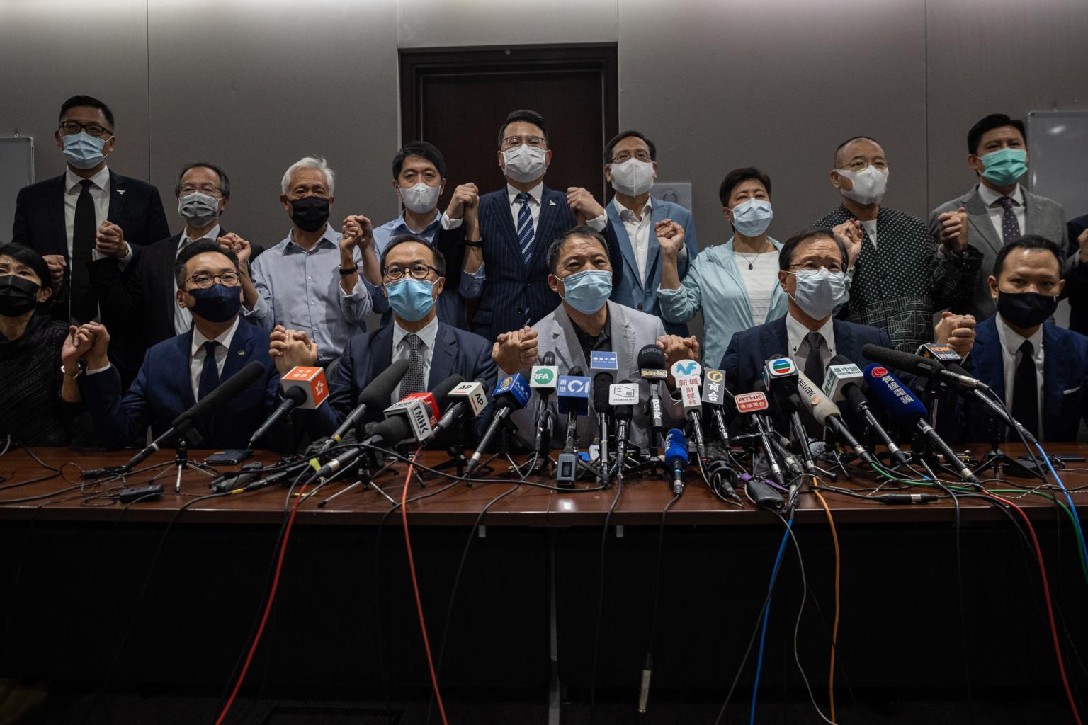 Chief Executive Carrie Lam's government immediately banished four legislators, prompting the remaining 15 in the 70-seat Legislative Council to resign en masse hours later at a joint press briefing.