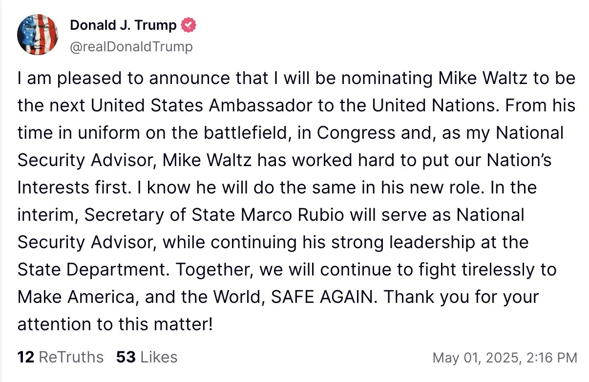 WASHINGTON – US President Donald Trump confirmed on May 1 that he was replacing his national security adviser Mike Waltz following a chat group leak, saying he would appoint him as ambassador to the United Nations instead.