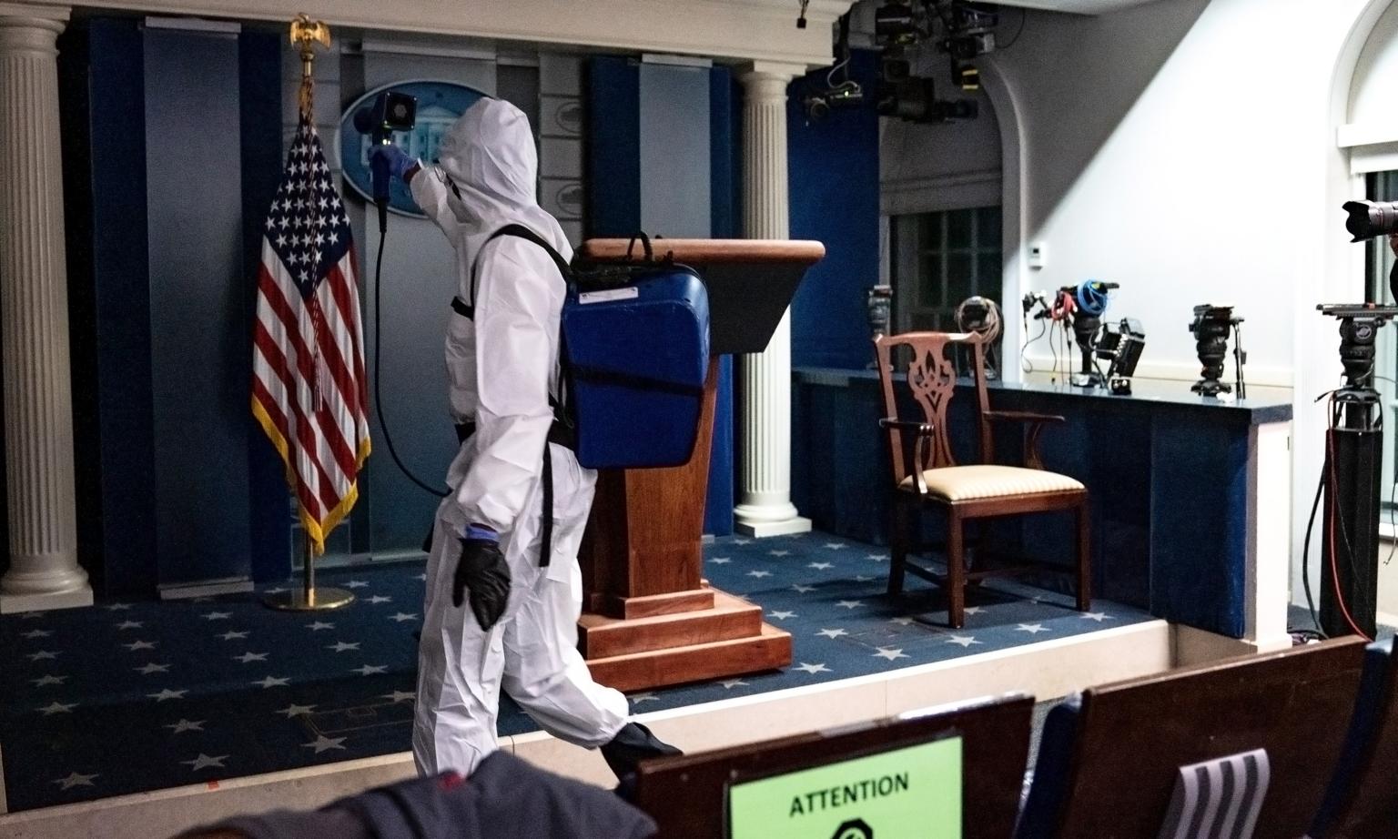 A member of the White House cleaning staff sprays disinfectant in the press briefing room in Washington on Oct 5, 2020.