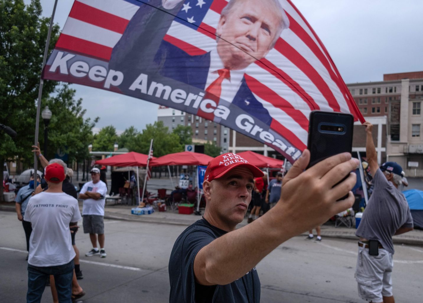 A Trump supporter takes a selfie near the BOK Centre on June 19, 2020, in Tulsa, Oklahoma.