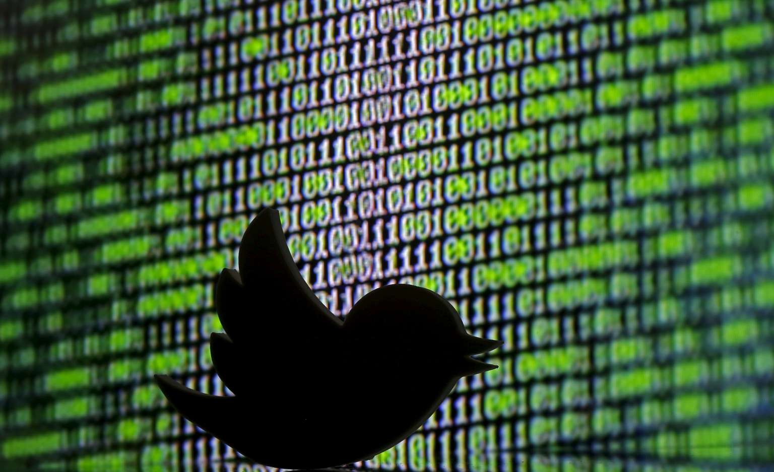 A Twitter logo is seen in front of a displayed cyber code on March 22, 2016.