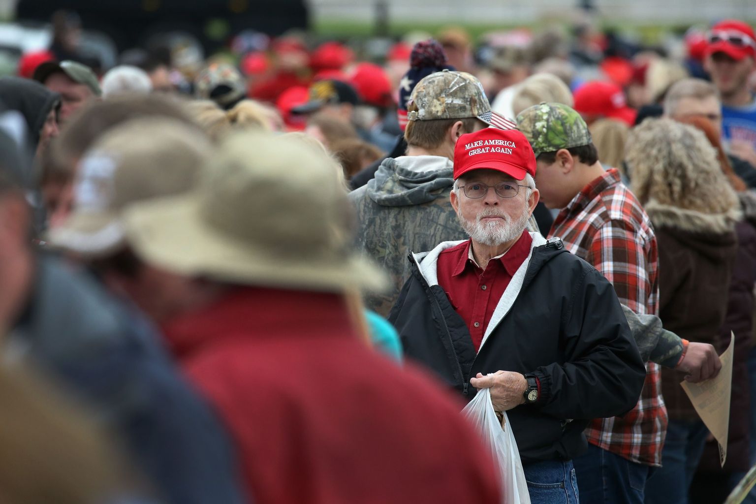 Supporters wait in line to see President Donald Trump at a rally in Columbia, Missouri.