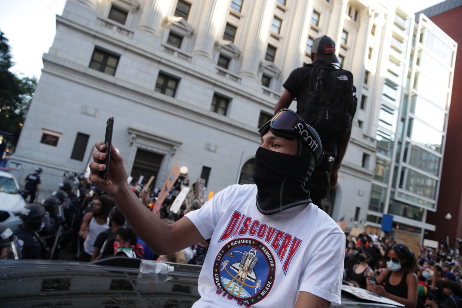 A protester uses his phone during a rally in Washington, DC, on May 31, 2020.