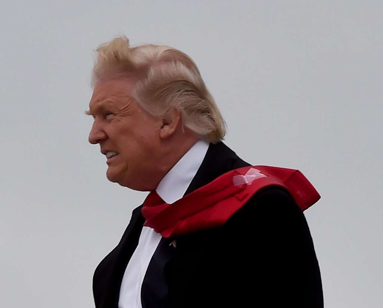 President -elect Donald Trump's tie caught in the wind as he gets off plane on Dec 1, 2016.