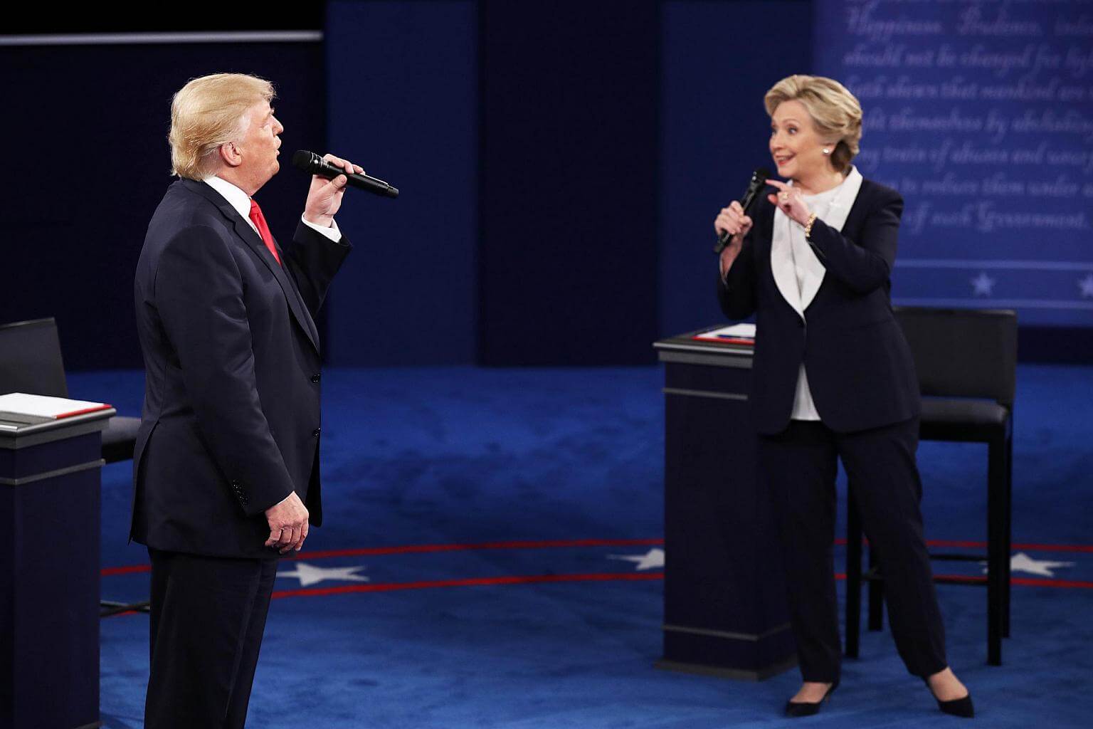 US Democratic presidential nominee Hillary Clinton and Republican presidential nominee Donald Trump at the town hall debate at Washington University on Oct 9, 2016.