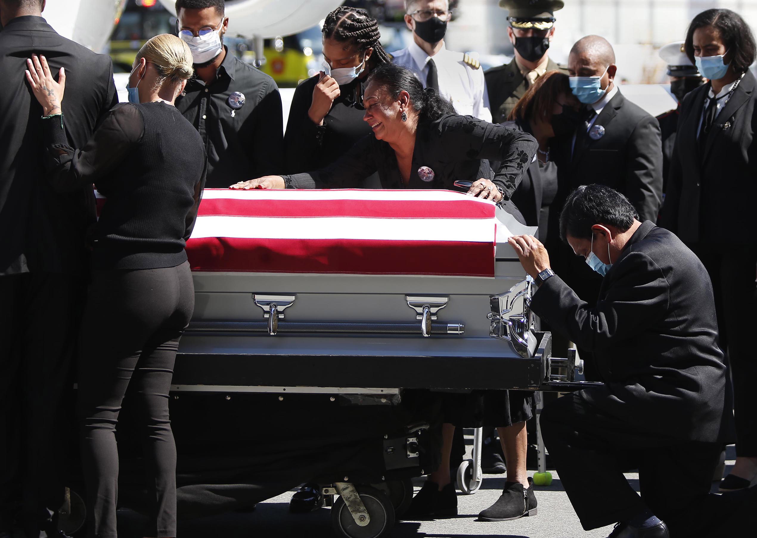 Family members of Sergeant Johanny Rosario react as her casket arrives at Logan Airport in Boston on Sept 11.
