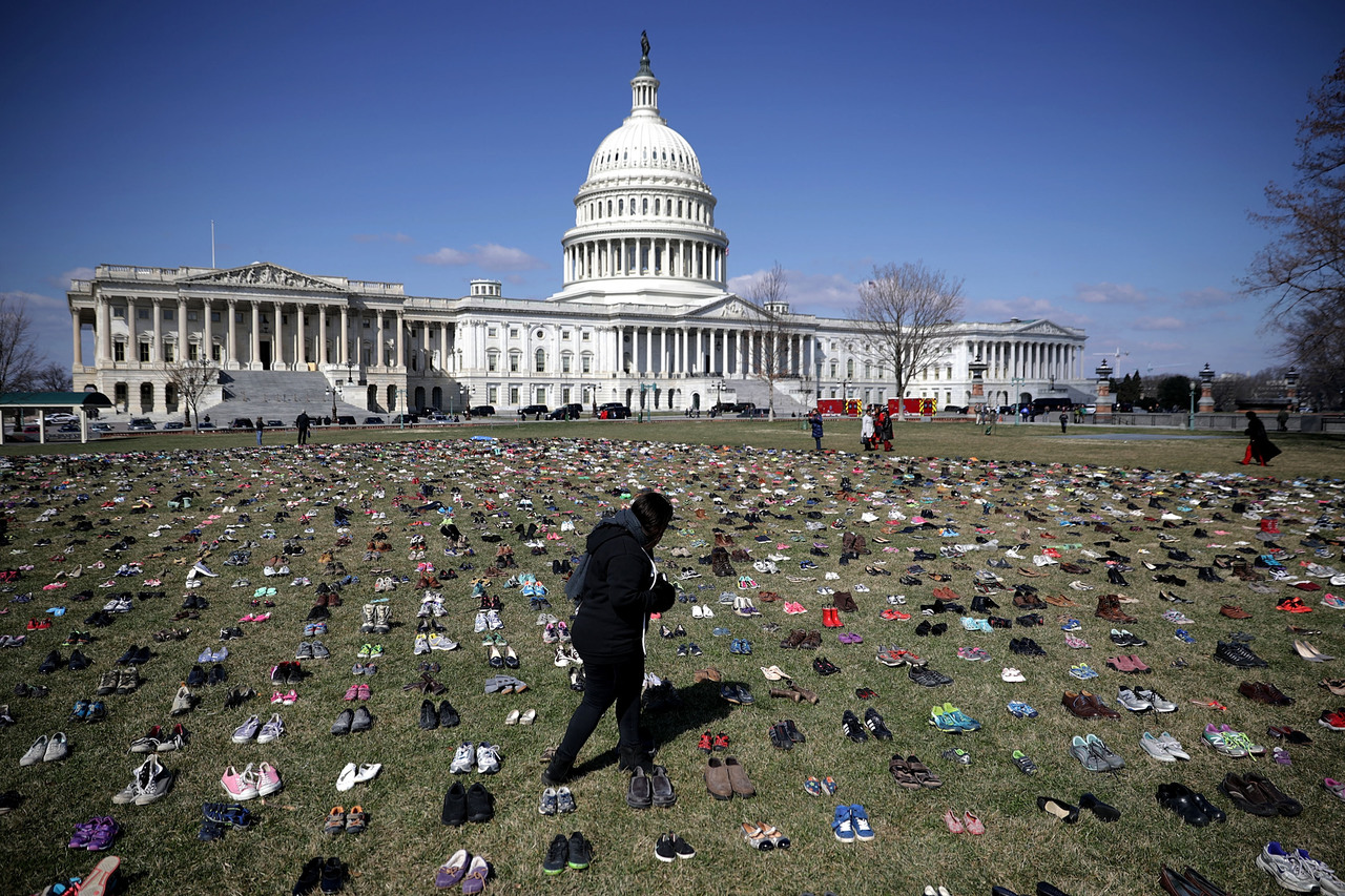 Seven thousand pairs of shoes, representing the children killed by gun violence, are spread out on the lawn of the US Capitol on March 13, 2018.