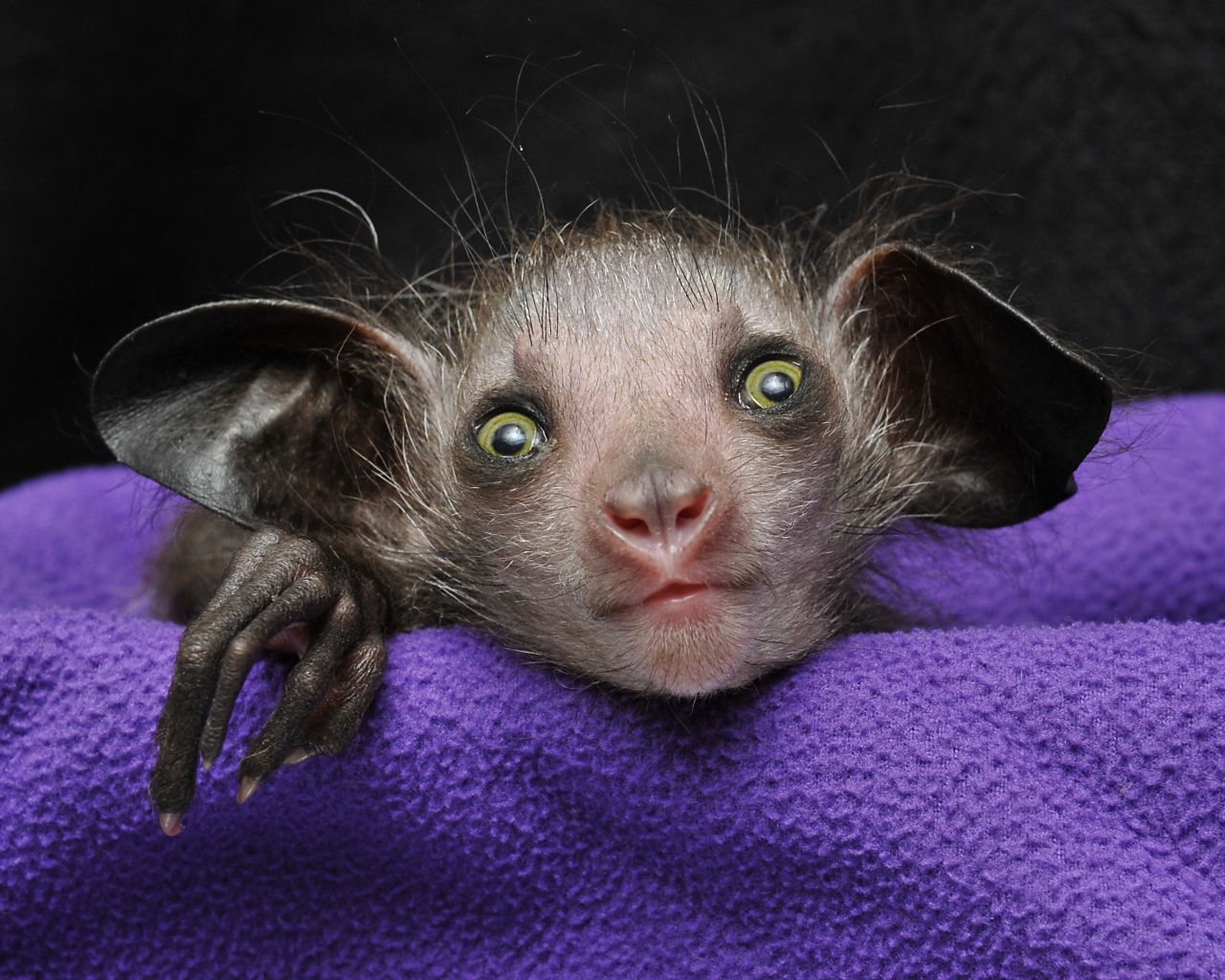 A young aye-aye looks into the camera at the Duke Lemur Centre.