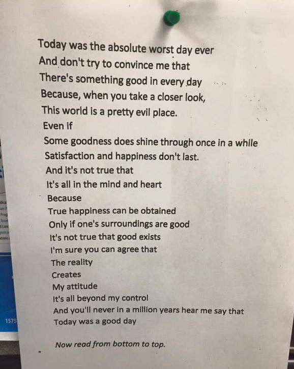 The poem, which Ms Chanie Gorkin posted on poetry site poetrynation.com, is about happiness, and when read from top to bottom, offers a negative perspective. When read from bottom upwards, however, the meaning of the poem transforms into a positive one.