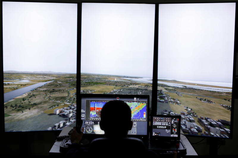 Military helicopter pilot Henery Jacobs uses a flight simulator at Coast Flight Training in San Diego, California, on Jan 15, 2019.
