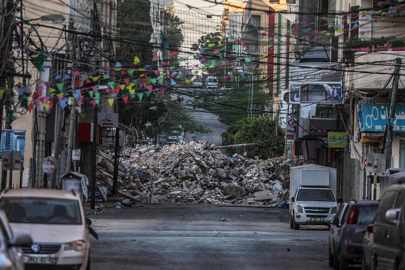 The rubble of a destroyed building seen after Israeli airstrikes, in Gaza City on May 19, 2021.
