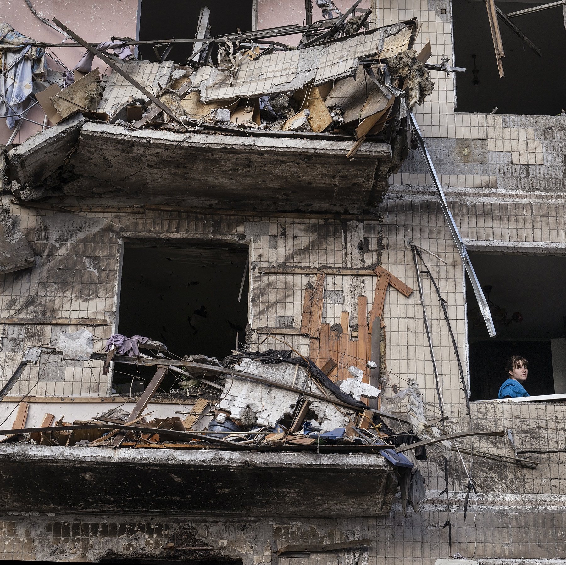 A residential building that was hit by missiles in southern Kyiv, Ukraine.