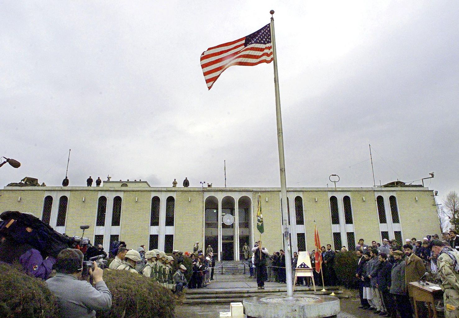A 2001 photo shows a flag-raising ceremony for the opening of the US embassy in the Afghan capital of Kabul.