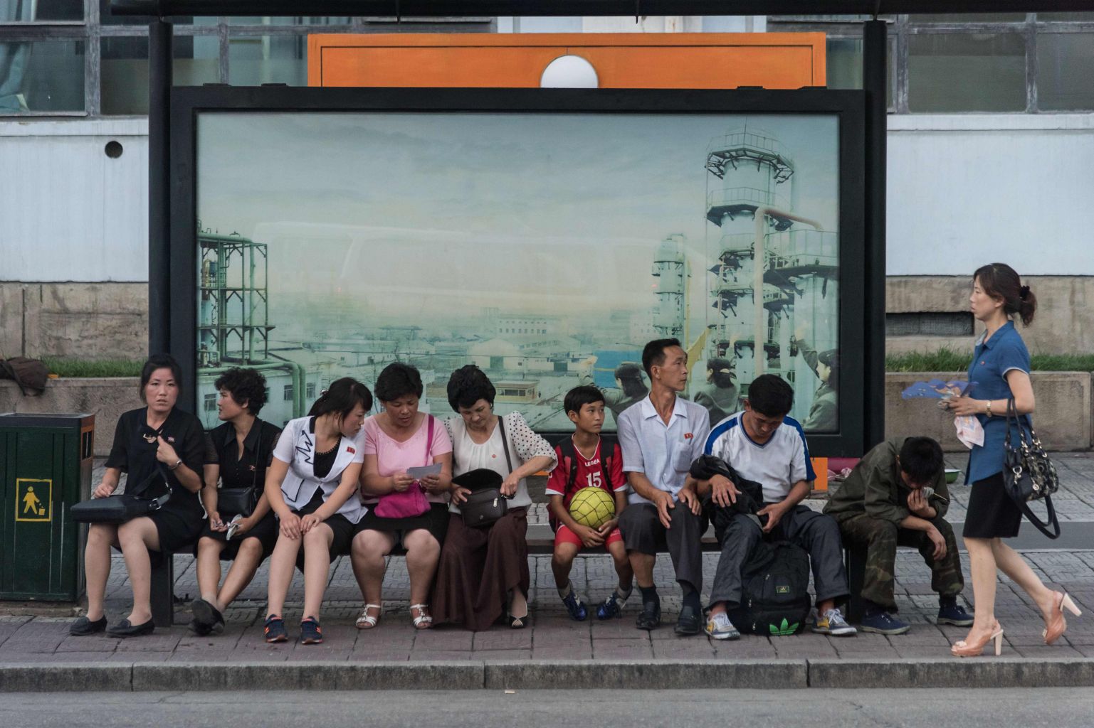 People wait at a trolley bus stop in Pyongyang, North Korea, July 28, 2017.