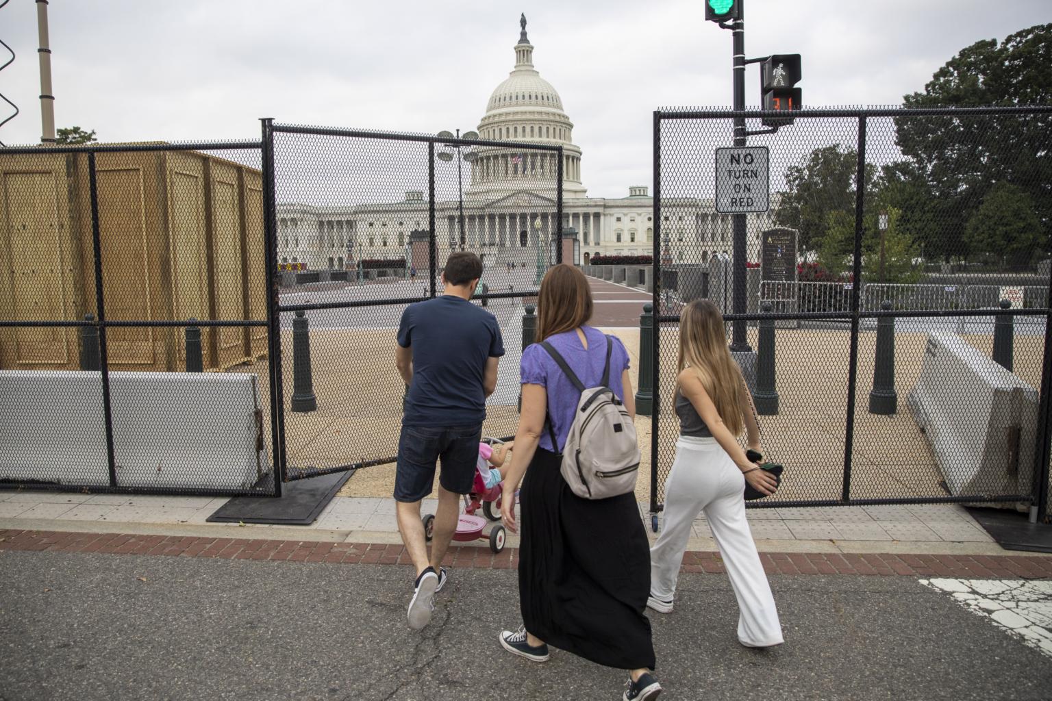 Pedestrians navigate temporary security fencing around the US Capitol in Washington, DC, on Sept 16, 2021.